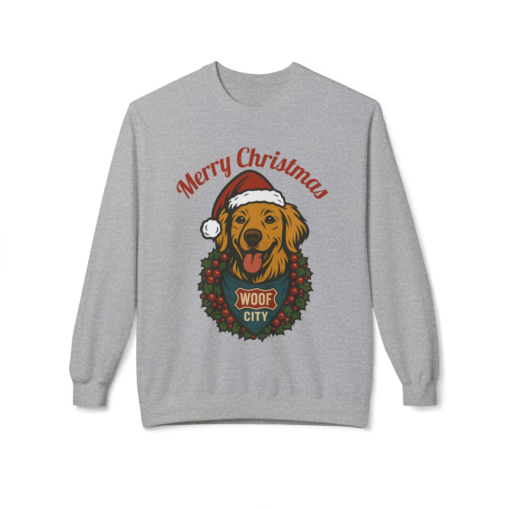 Wrap yourself in warmth and wagging tails this season with our cozy, midweight holiday crewneck! Featuring a golden retriever in a Santa hat framed by a festive wreath, this sweatshirt celebrates dog lovers who know the holidays are better with four-legged joy.